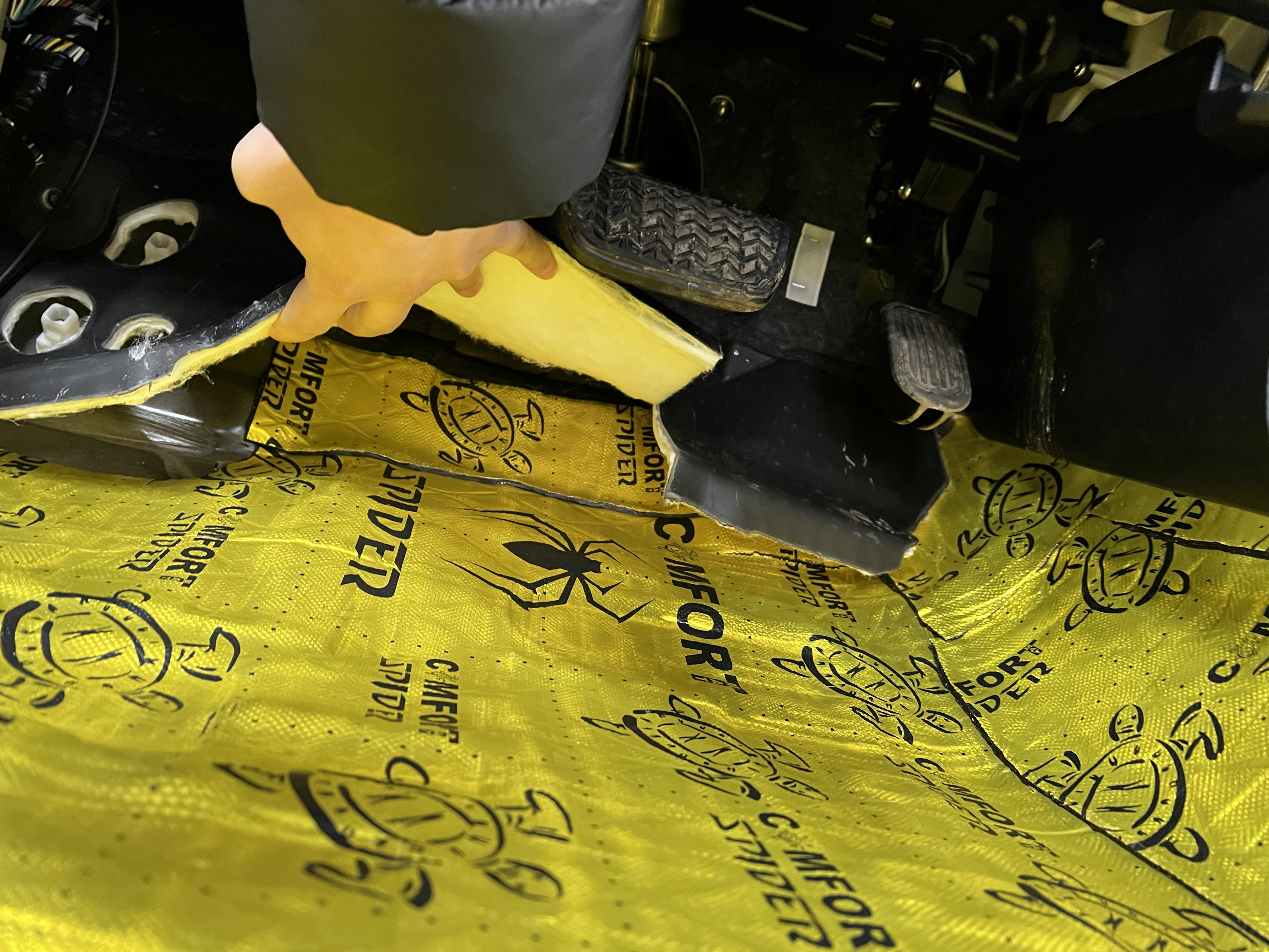 Вторым слоем уложили Шумоизоляцию Comfort Mat Premium Skyline, легкий и эффективный материал, завершающий изоляцию.
